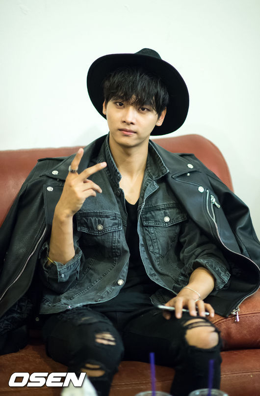 지난 25일 서울 강남구 논현동의 한 스튜디오에서 슈퍼주니어의 강인과 은혁, 김종민, 조세호, 엔(빅스)이 한데 모여 화보촬영을 진행했다. 엔이 화보 촬영을 기다리며 카메라를 향해 브이 사인을 하고 있다.