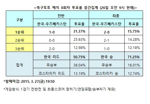 국민체육진흥공단(www.kspo.or.kr)이 발행하는 체육진흥투표권 공식 온라인 발매 사이트 베트맨(www.betman.co.kr)이 오는 27일(금) 오후 8시에 대전월드컵경기장에서 열리는 국가대표 평가전 한국(홈)-우즈베키스탄(원정)전을 대상으로 한 축구토토 매치 8회차 투표율 중간집계 결과, 전체 참가자의 71.25%가 한국의 승리를 전망했다고 밝혔다.