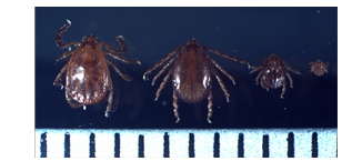 작은소피참진드기 왼쪽부터 암컷, 수컷, 약충, 유충(눈금 한 칸 1mm)./보건부 제공.