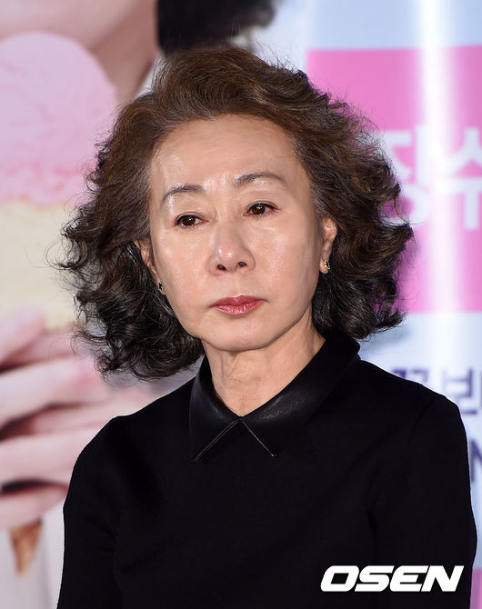 배우 윤여정이 취재진의 질문을 듣고 있다.