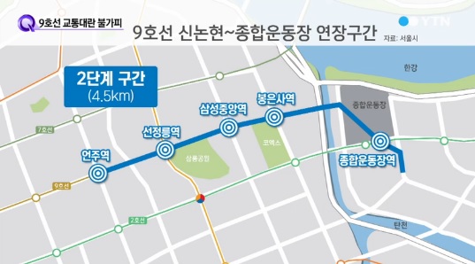 2009년 개통 후 2015년 3월 현재 하루 44만 명이 이용하고 있는 서울 지하철 9호선은 노선이 길어지면서 '지옥철 대란'이 더욱 심화될 것으로 보인다. 전동차 운행 횟수가 줄어든데다 종합운동장 쪽으로 향하는 사람이 더 몰리기 때문이다.
