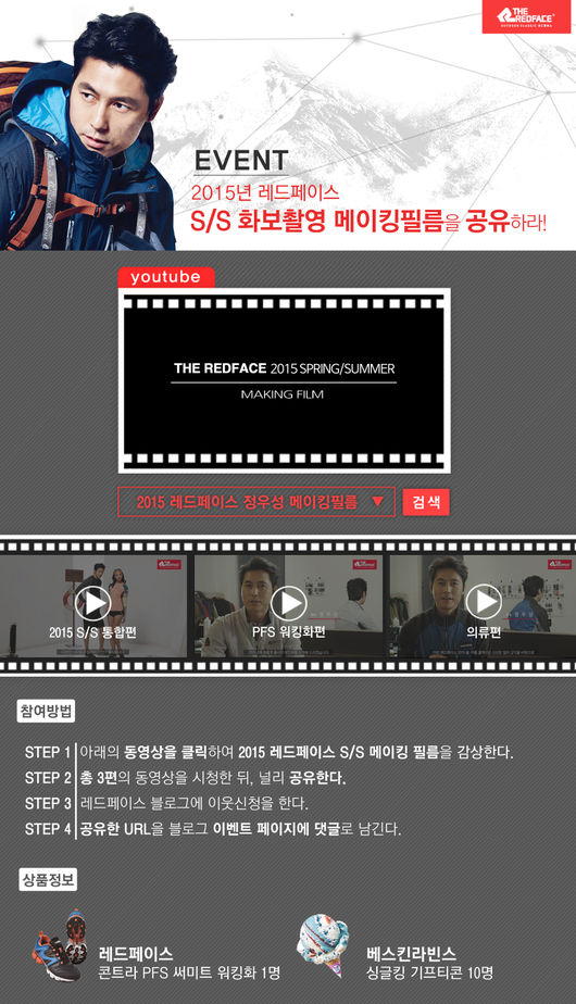 한편 레드페이스는 이번 화보공개에 맞추어 'S/S 화보촬영 메이킹 필름 공유' 온라인 이벤트를 진행한다. 공유 이벤트는 4월 1일까지 진행하며 누구나 레드페이스 공식 블로그(http://blog.naver.com/rf58) 혹은 공식 페이스북(https://www.facebook.com/THEREDFACE?fref=photo)을 통해 응모할 수 있다.