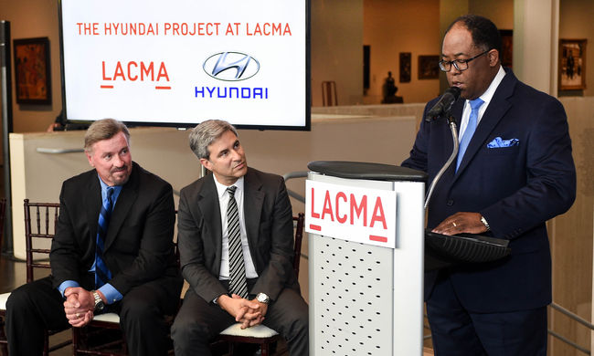 데이브 주코브스키(David Zuchowski) 현대차 미국판매법인 사장(사진 왼쪽), 마이클 고반 LACMA 미술관장(가운데)이 함께한 가운데, 마크 리들리 토마스(Mark Ridley-Thomas) LA카운티 수퍼바이저(사진 오른쪽)가 소감을 밝히고 있다. /현대자동차 제공.