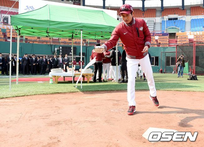 넥센 염경엽 감독이 홈 베이스에 술을 뿌리며 우승을 기원하고 있다.