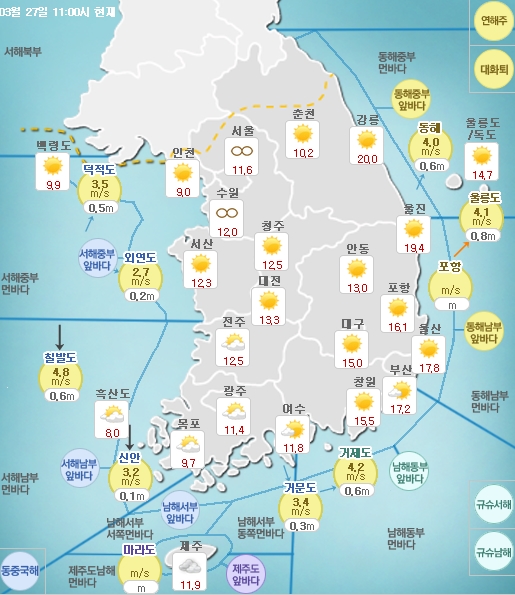 27일 기상청에 따르면 오늘 날씨는 전국이 맑으나 제주도는 구름이 많다. 서해안 일부 지역에 안개가 낀 곳이 있다.