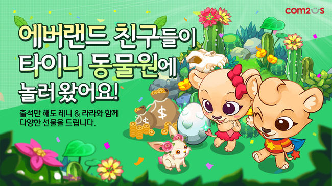 우선 1차 출석 이벤트를 통해 3일 및 7일 동안 타이니팜에 매일 접속한 유저에게 에버랜드의 대표 캐릭터인 사자 ‘레니’와 ‘라라’ 아이템을 각각 증정한다.