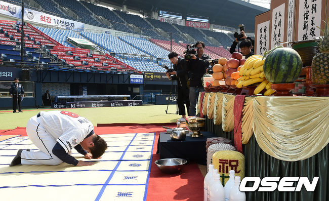 두산 김태형 감독이 기원제 고사를 지내고 있다.