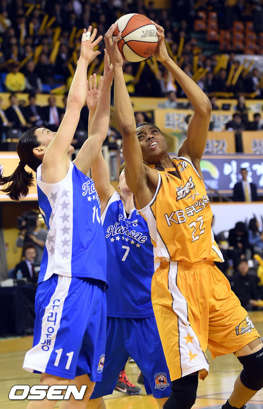 27일 오후 충북 청주시 청주체육관서 열린 KB국민은행 2014-2015 여자프로농구 챔피언결정전(5전3승제) 4차전 청주 국민은행과 춘천 우리은행의 경기, 2쿼터 국민은행 비키바흐와 우리은행 임영희가 공중볼을 다투고 있다.