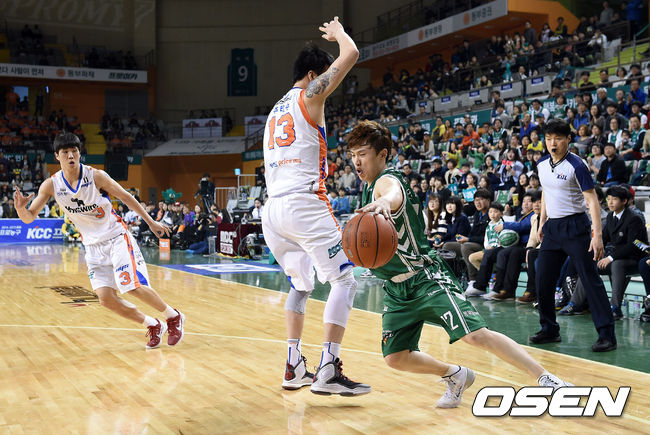 3쿼터 동부 안재욱이 주태수의 수비를 피해 드리블을 하고 있다.