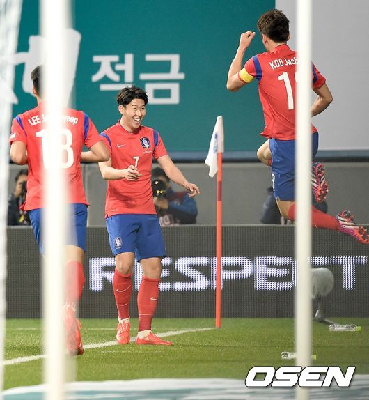 27일 오후 대전월드컵경기장에서 열린 한국과 우즈베키스탄의 축구국가대표평가전, 전반 한국 구자철이 선제골을 넣은 뒤 손흥민과 기뻐하고 있다.