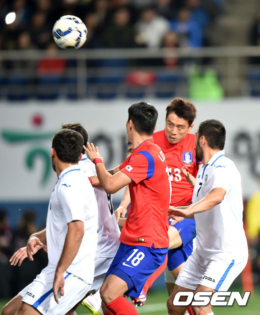 27일 오후 대전월드컵경기장에서 열린 한국과 우즈베키스탄의 축구국가대표평가전 전반 한국 구자철이 선제 헤딩골을 넣고 있다.