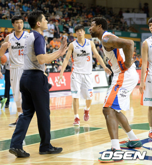 3쿼터 전자랜드 포웰이 동부 김주성과 몸다툼 과정에서 파울을 선언 당하자 판정에 불만을 나타내고 있다.