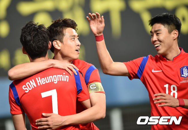 27일 오후 대전월드컵경기장에서 열린 한국과 우즈베키스탄의 축구국가대표평가전 전반 한국 구자철이 선제 헤딩골을 넣은 후 손흥민 이정협과 기쁨을 나누고 있다.