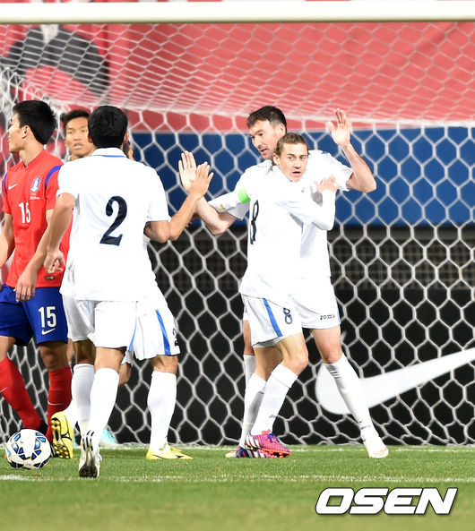 27일 오후 대전월드컵경기장에서 열린 한국과 우즈베키스탄의 축구국가대표평가전 전반 우즈벡 조히르 쿠지보에프의 동점골을 성공시킨 후 기뻐하고 있다.