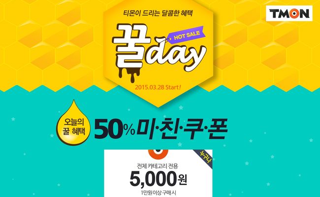 티켓몬스터(대표 신현성)가 운영하는 국내 대표 소셜커머스 티몬(www.tmon.co.kr)은 28일 자정부터 31일까지 도서 및 환금성 제품을 제외한 지역, 패션·뷰티, 쇼핑, 컬쳐, 여행·레저 등 전체 카테고리 모든 상품을 대상으로 1만 원 이상 구매 시 5000원 할인쿠폰을 제공하는 '꿀day' 프로모션을 전격 실시한다고 밝혔다.