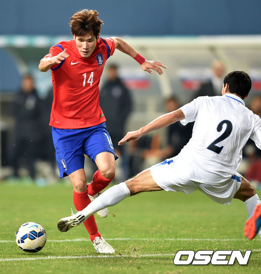 포백 라인은 윤석영(퀸스 파크 레인저스)와 곽태휘(알 힐랄), 김기희(전북 현대), 정동호(울산 현대)로 구성됐다. 골키퍼 장갑은 김승규(울산 현대)가 차지했다.