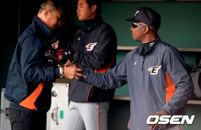 경기에 앞서 한화 모건이 더그아웃에서 코칭스태프와 인사를 나누고 있다.