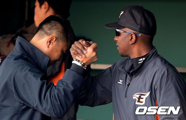 경기에 앞서 한화 모건이 더그아웃에서 코칭스태프와 인사를 나누고 있다.
