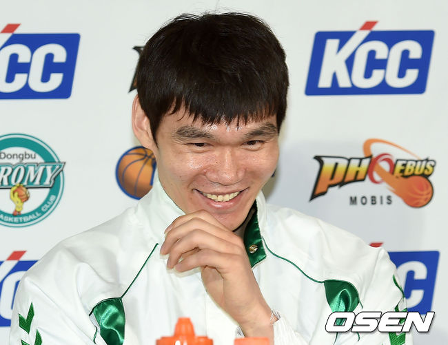 동부 김주성이 모비스 유재학 감독의 농담에 미소를 짓고 있다.