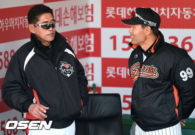 28일 오후 부산 사직구장서 열리는 '2015 타이어뱅크 KBO 리그' 개막전에 앞서 조범현과 이종운 감독이 이야기를 나누고 있다.