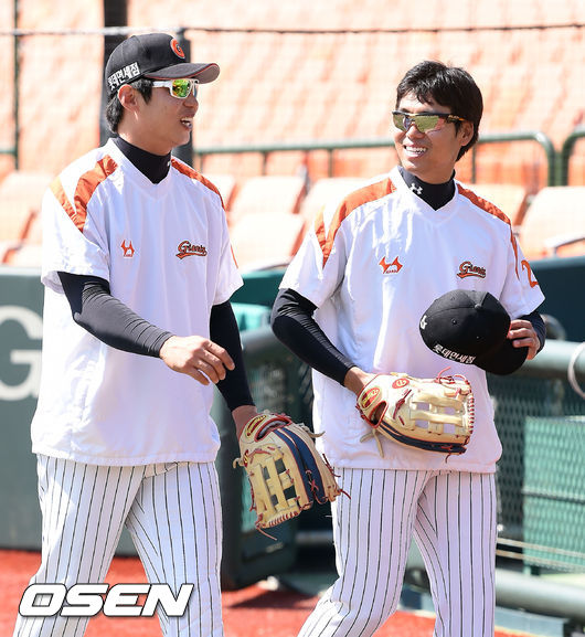 28일 오후 부산 사직구장서 열리는 '2015 타이어뱅크 KBO 리그' 개막전에 앞서 롯데 이대우와 김문호가 이야기를 나누며 더그아웃으로 들어가고 있다.
