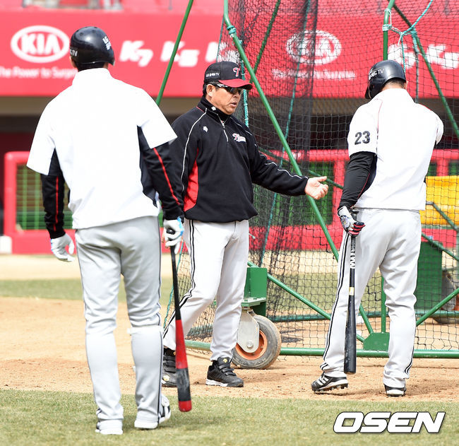 28일 오후 광주 광주-KIA챔피언스필드에서 '2015 타이어뱅크 KBO 리그' 개막전 KIA와 LG의 경기에 앞서 LG 양상문 감독이 최경철과 이야기를 나누고 있다.
