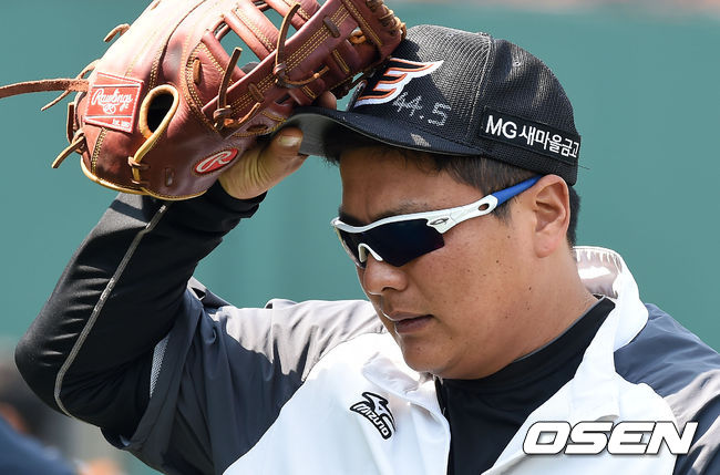 경기에 앞서 한화 김태균이 훈련을 하고 있다. 김태균 모자의 번호는 부상중인 조인성(44)과 정현석(5)의 등번호로 같이 뛰자는 의미이다.