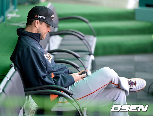 경기에 앞서 한화 탈보트가 더그아웃에서 경기를 준비하고 있다.