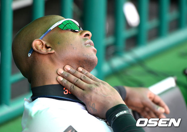 경기에 앞서 한화 모건이 더그아웃에서 휴식을 취하고 있다.
