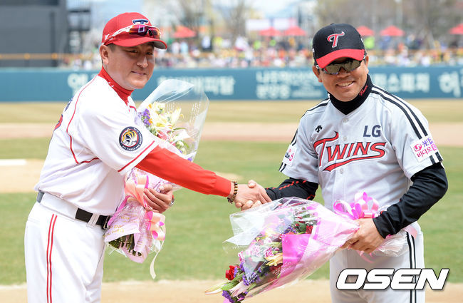 28일 오후 광주 광주-KIA챔피언스필드에서 '2015 타이어뱅크 KBO 리그' 개막전 KIA와 LG의 경기에 앞서 KIA 김기태 감독과 LG 양상문 감독이 악수를 나누고 있다.