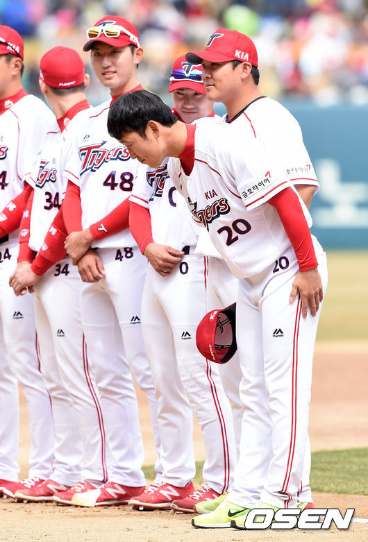 28일 오후 광주 광주-KIA챔피언스필드에서 '2015 타이어뱅크 KBO 리그' 개막전 KIA와 LG의 경기에 앞서 KIA 윤석민이 팬들에게 인사를 하고 있다.