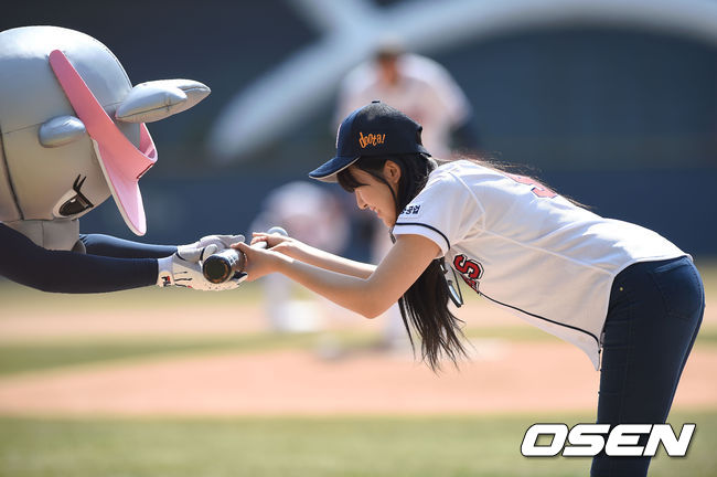 AOA 찬미가 두산 마스코트에게 배트를 건네 받고 있다.