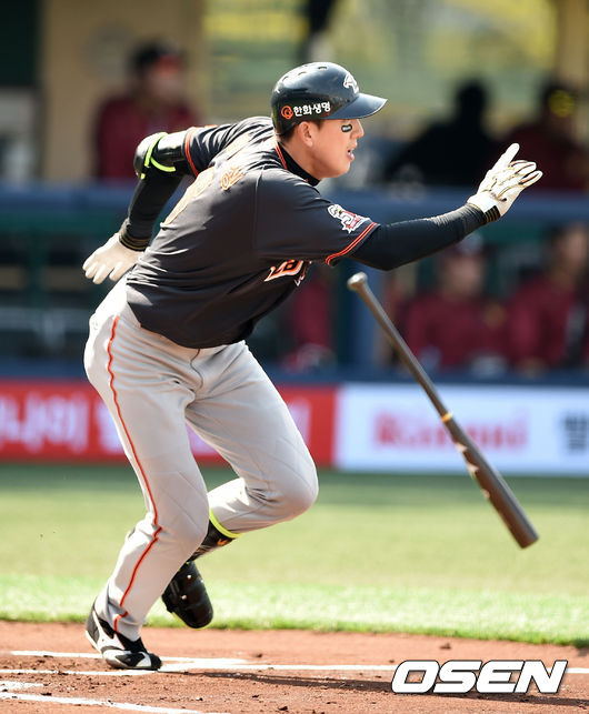 2회초 1사에서 한화 김회성이 중전안타를 날리고 있다.