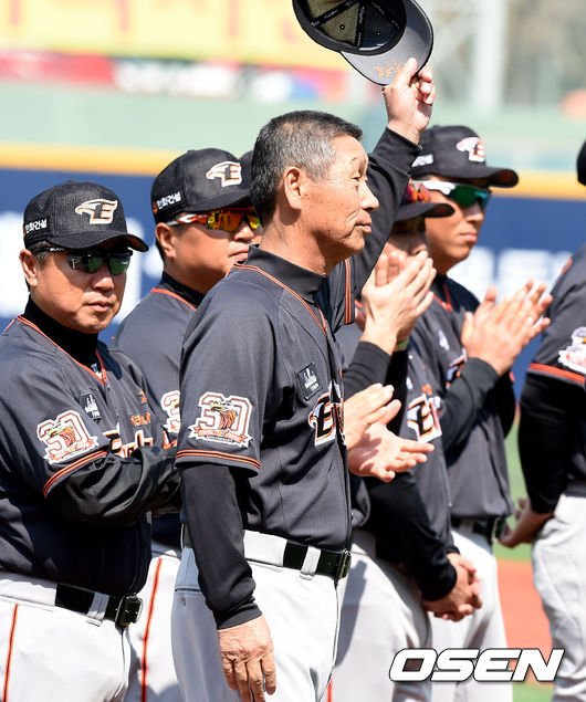 경기에 앞서 한화 김성근 감독이 팬들에 인사를 하고 있다.