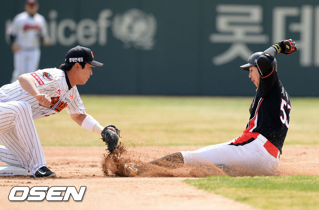 28일 오후 부산 사직구장서 열린 '2015 타이어뱅크 KBO 리그' 개막전, 1회초 kt 이대형이 도루 실패하고 있다.