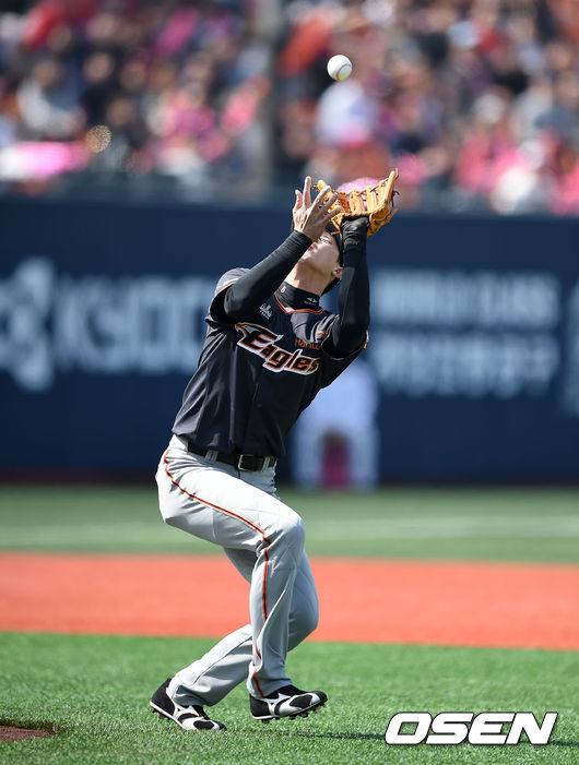 1회말 1사에서 한화 김회성이 넥센 이택근의 내야 플라이 타구를 잡아내고 있다.