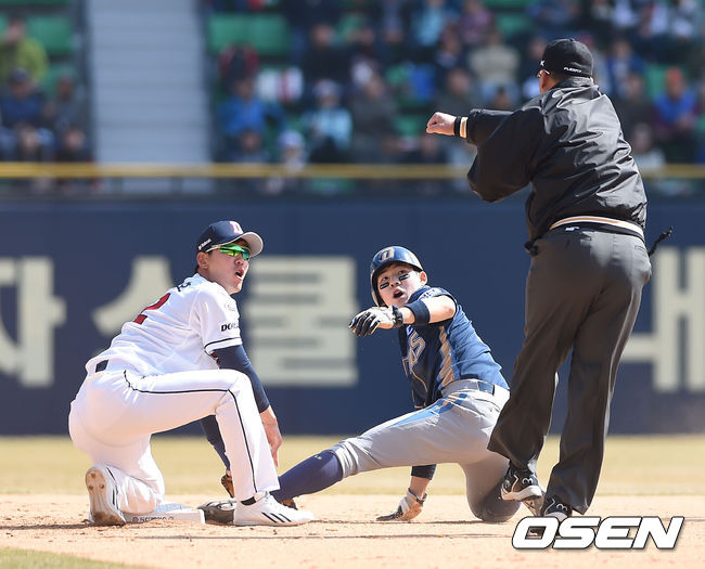 2회초 2사 NC 박민우가 2루 도루를 시도하다 아웃당하고 있다.