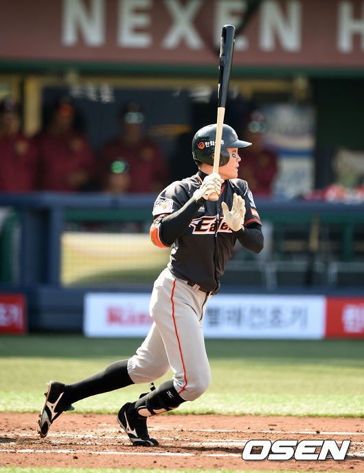 3회초 1사에서 한화 강경학이 좌중간 안타를 날리고 있다.
