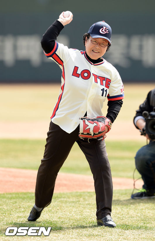 김 여사는 마운드에 올라 야구장을 찾은 팬들에게 정성스럽게 인사를 했다. 다소곳하게 인사를 마친 김 여사는 갑자기 투사로 돌변, 30년 전 아들처럼 발로 마운드 흙을 고르기 시작했다. 로진을 쥐었다가 놓은 뒤 바짓자락을 매만지고, 곧이어 모자을 쓰다듬은 뒤 안경을 손가락으로 치켜 올렸다. 그리고는 아들과 같은 투구폼으로 힘차게 공을 뿌렸다. 시구가 끝난 뒤에는 포수 강민호와 뜨거운 포옹을 했다.