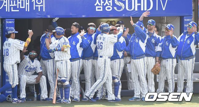 3회말 삼성 공격 1사 2, 3루 상황 구자욱의 2타점 우익수 방면 2루타로 홈을 밟은 박석민과 이승엽이 더그아웃도 동료들과 인사를 나누고 있다.