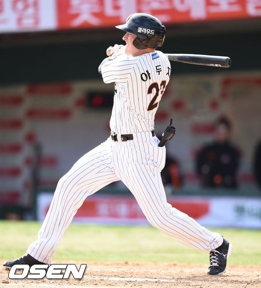 28일 오후 부산 사직구장서 열린 '2015 타이어뱅크 KBO 리그' 개막전,3회말 1사 1루 롯데 아두치가 안타를 날리고 있다.