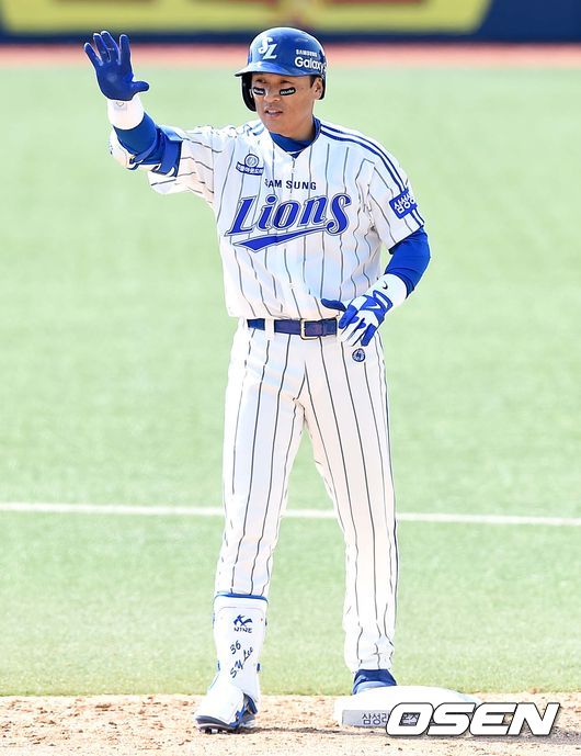 3회말 삼성 공격 1사 1, 3루 상황 이승엽이 1타점 우익수 방면 2루타를 날리고 2루에 안착해 타임을 외치고 있다.