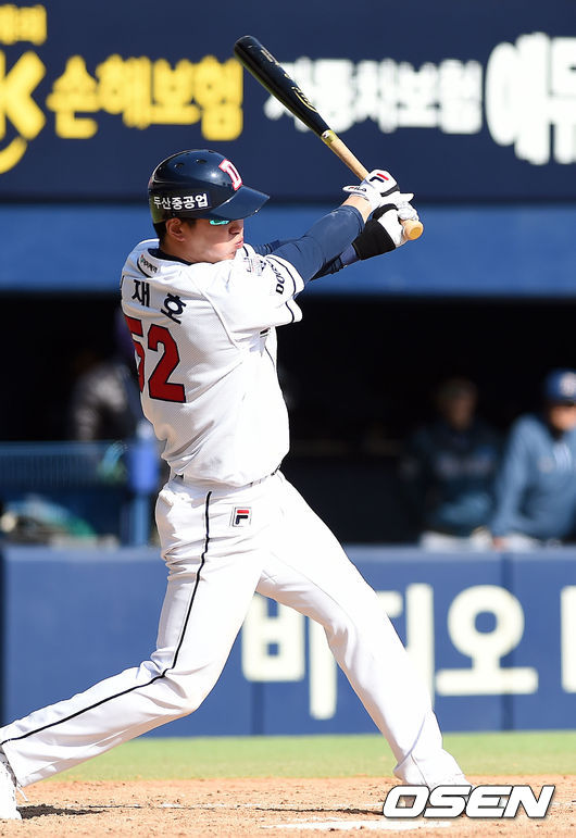 4회말 2사 만루 두산 김재호가 2타점 적시타를 때리고 있다.