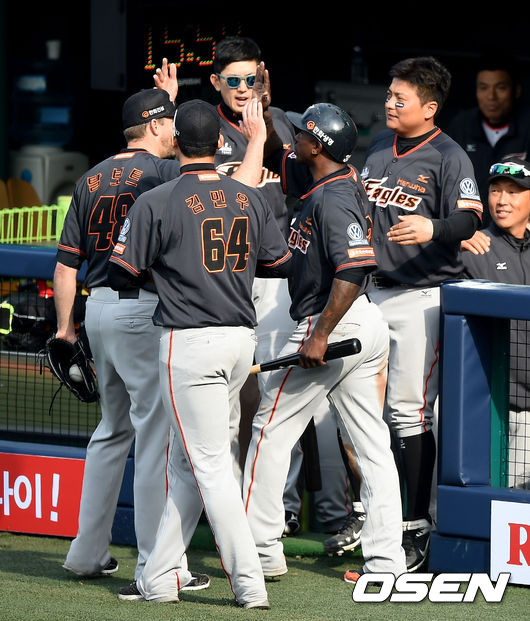 6회초 2사 3루에서 한화 나이저 모건이 강경학의 적시타에 홈을 밟고 동료선수들과 하이파이브를 하고 있다.