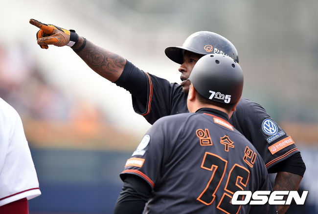 8회초 무사에서 한화 모건이 우전 안타를 날리고 기뻐하고 있다.
