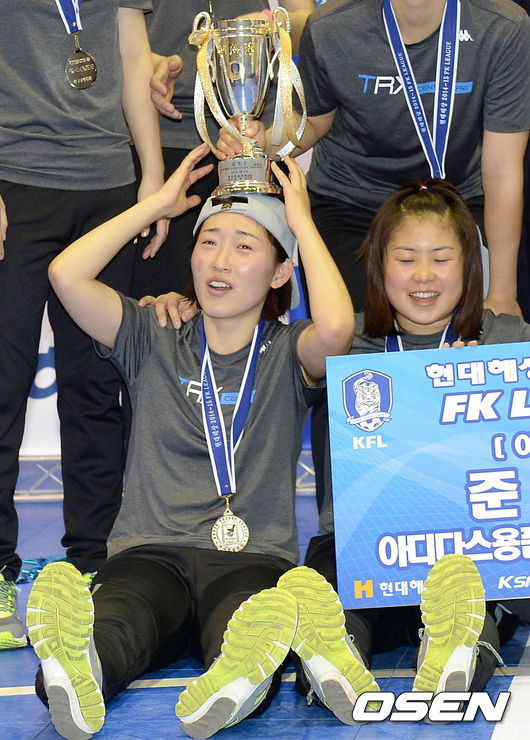 시상식 종료후 준우승을 차지한 부산카파FC 정혜진이 트로피를 머리 위에 올려놓고 포토타임을 갖고 있다. /greenfield@osen.co.kr