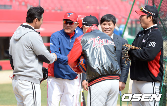 29일 오후 광주-KIA챔피언스필드에서 진행된 '2015 타이어뱅크 KBO 리그' KIA와 LG의 경기에 앞서 KIA 김기태 감독이 LG 선수들과 인사를 나누고 있다.