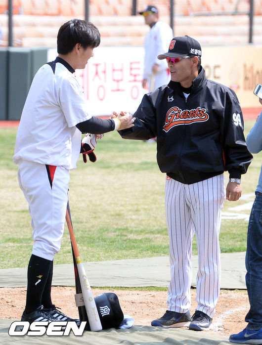 29일 오후 부산 사직구장서 열린 '2015 타이어뱅크 KBO 리그' 롯데 자이언츠와 kt위즈의 경기에 앞서 롯데 이종운 감독이 kt위즈 장성호와 이야기를 나누고 있다.