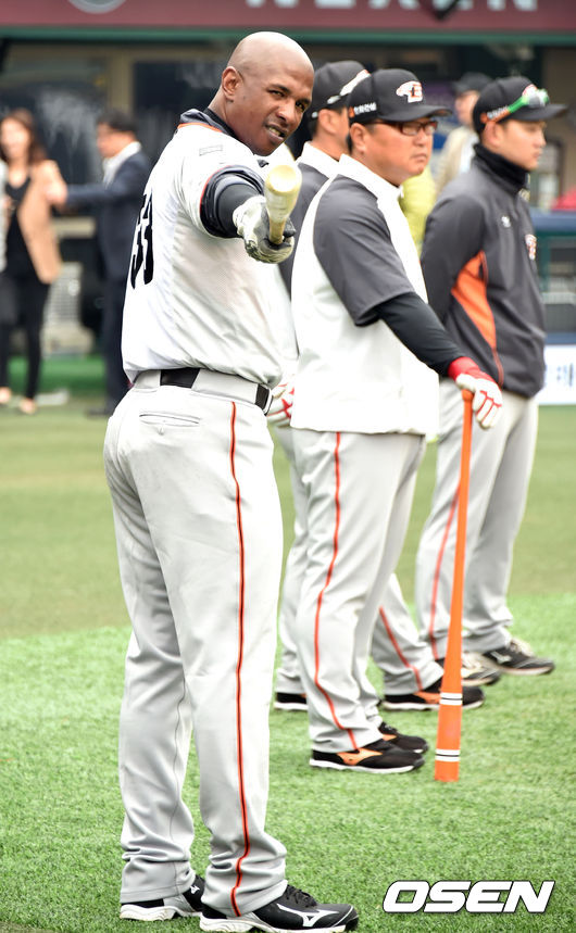 29일 목동구장에서 벌어진 '2015 타이어뱅크 KBO 리그' 넥센 히어로즈와 한화 이글스의 경기 전 나이저 모건이 취재진을 향해 방망이를 치켜들고 있다.