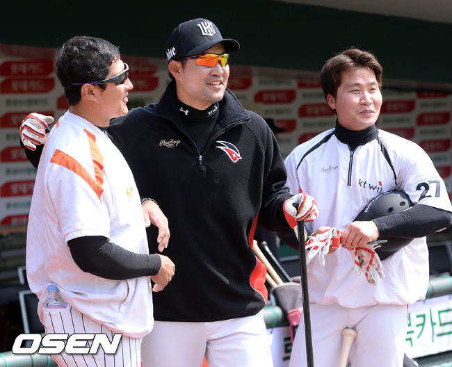 29일 오후 부산 사직구장서 열린 '2015 타이어뱅크 KBO 리그' 롯데 자이언츠와 kt위즈의 경기에 앞서 kt위즈 이숭용 코치와 용덕한, 롯데 황재균이 이야기를 나누고 있다.